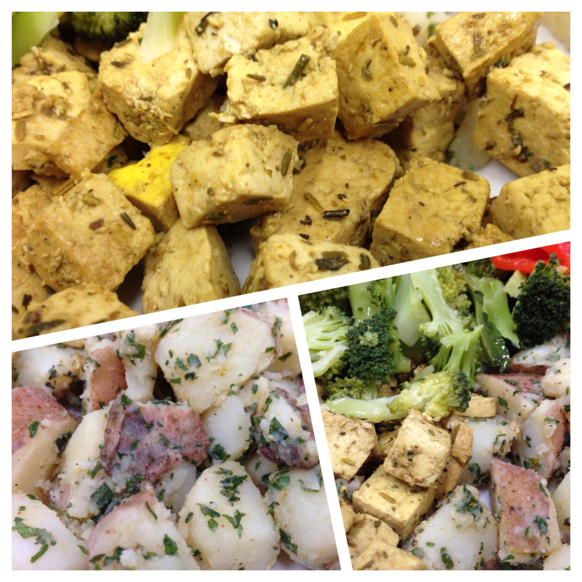 Cortar o tofu em cubinhos, deitar na frigideira (já? sim já!), temperar com molho de soja, vinho tinto, pimenta, gengibre, açafrão e ervas provençais.
